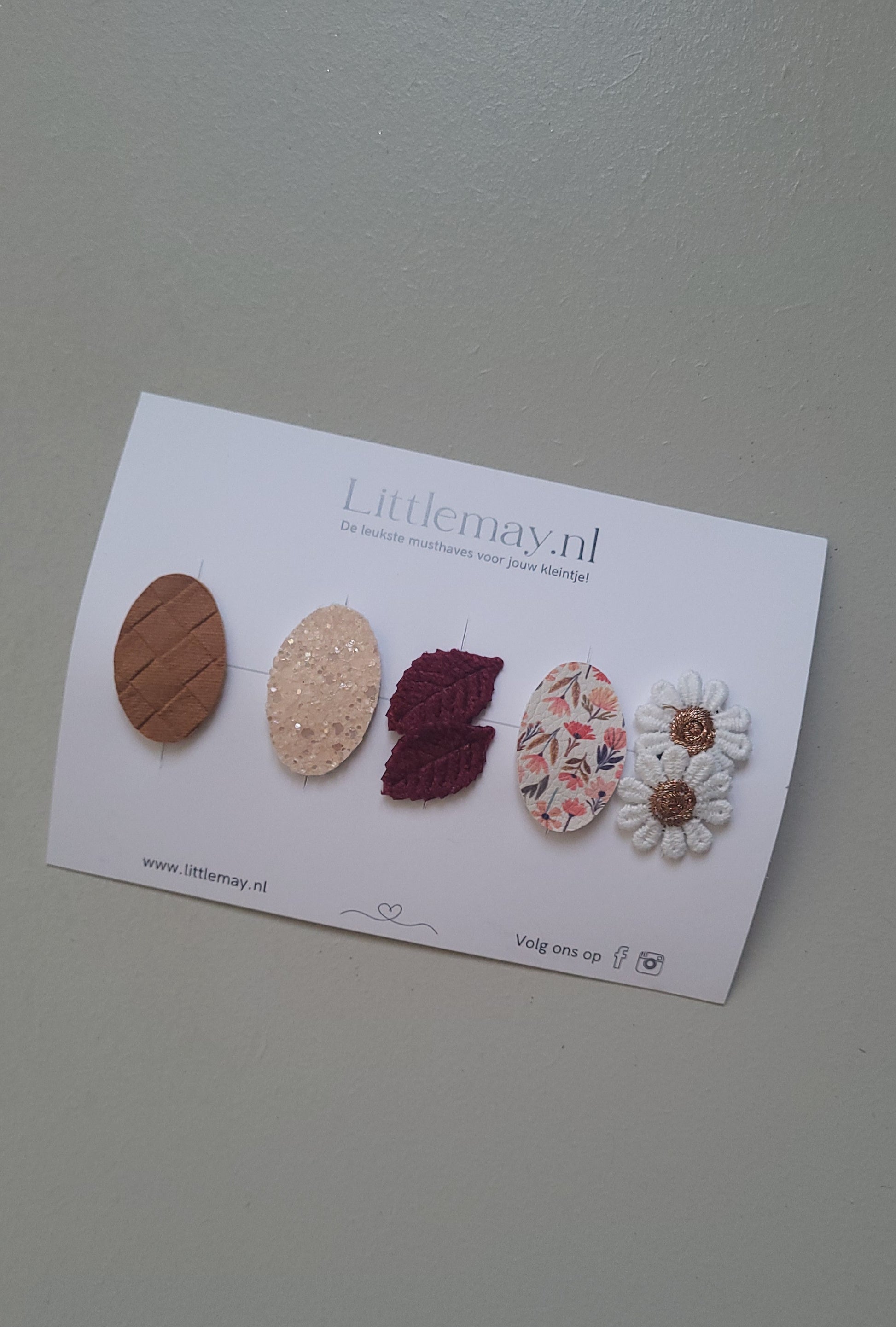 Haarspeldjes Antislip | Set 1 bestaat uit 5 haarspeldjes met lieve applicaties en bijpassende stoffen in verschillende kleurtinten.
